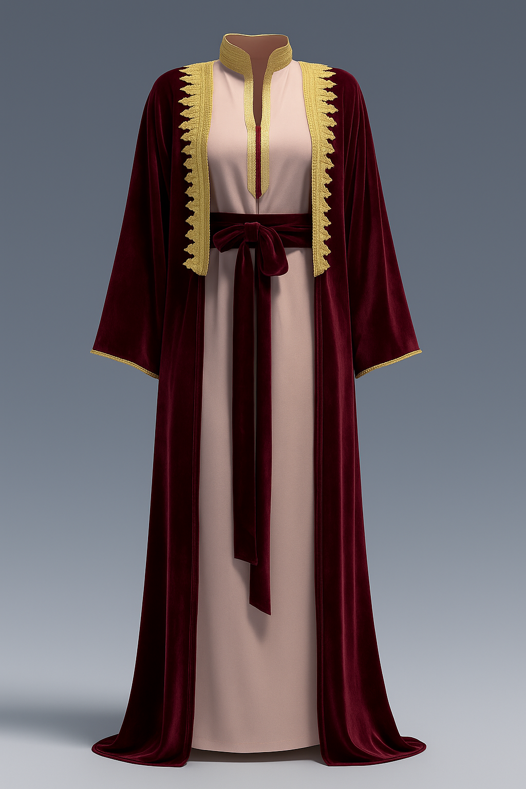 مودال تقليدي راقٍ بتصميم يجمع بين اللمسة الكلاسيكية والأناقة العصرية. يتميز بخياطة دقيقة مع قصة انسيابية تمنح راحة وأناقة في آن واحد. الياقة مصممة بشكل هندسي راقٍ، مزوّدة بتفاصيل يدوية تضيف فخامة للمودال، مع حزام بنفس الطابع لإبراز القوام. خيار مثالي للمناسبات والطلعات الراقية