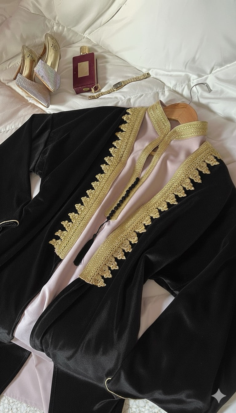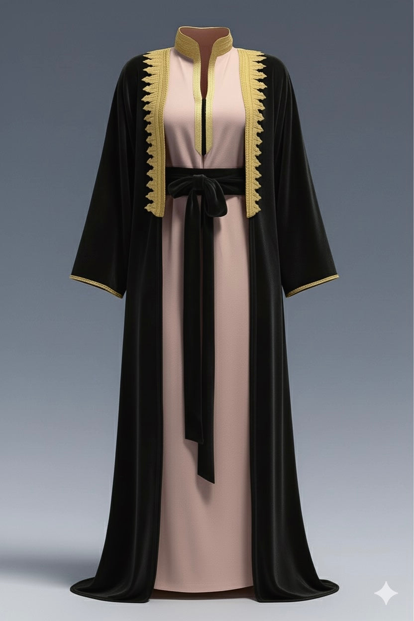 مودال تقليدي راقٍ بتصميم يجمع بين اللمسة الكلاسيكية والأناقة العصرية. يتميز بخياطة دقيقة مع قصة انسيابية تمنح راحة وأناقة في آن واحد. الياقة مصممة بشكل هندسي راقٍ، مزوّدة بتفاصيل يدوية تضيف فخامة للمودال، مع حزام بنفس الطابع لإبراز القوام. خيار مثالي للمناسبات والطلعات الراقية