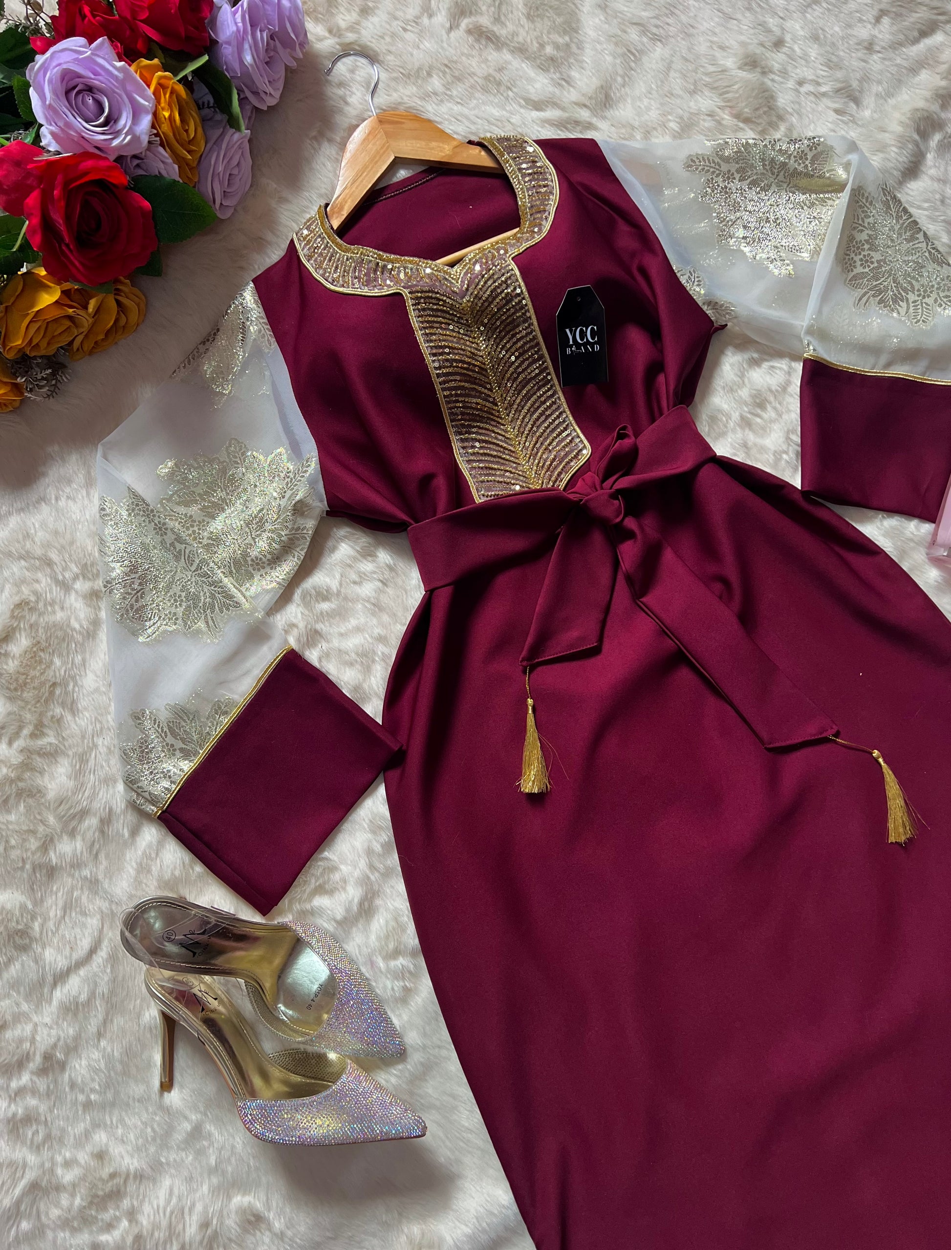 فستان انيق برقبة ذهبية واكمام من قماش الثليجة التقليدي الجزائري