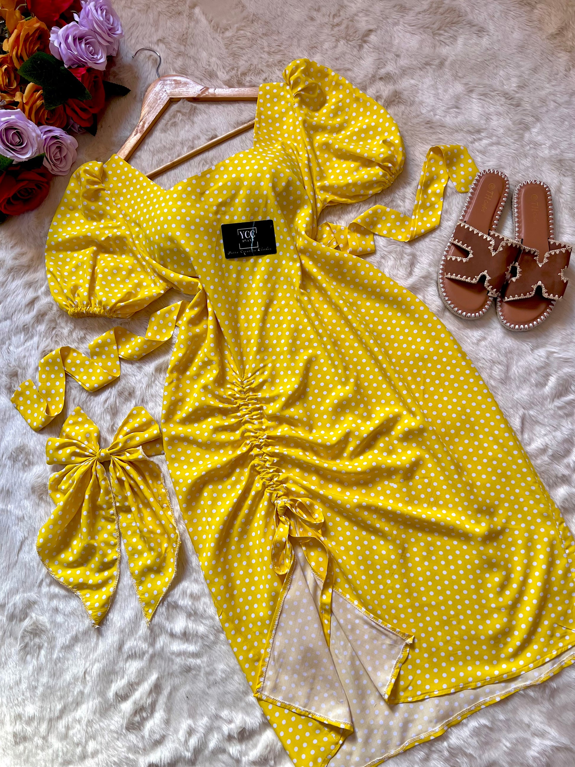 فستان بنقاط صغيرة بتصميم أنثوي ناعم، يتميّز بقصّة مجمّعة من الأمام تُبرز الخصر وتمنح لمسة رقيقة وجذّابة. أكمامه المنفوخة تضيف لمسة من الفخامة والعصرية،