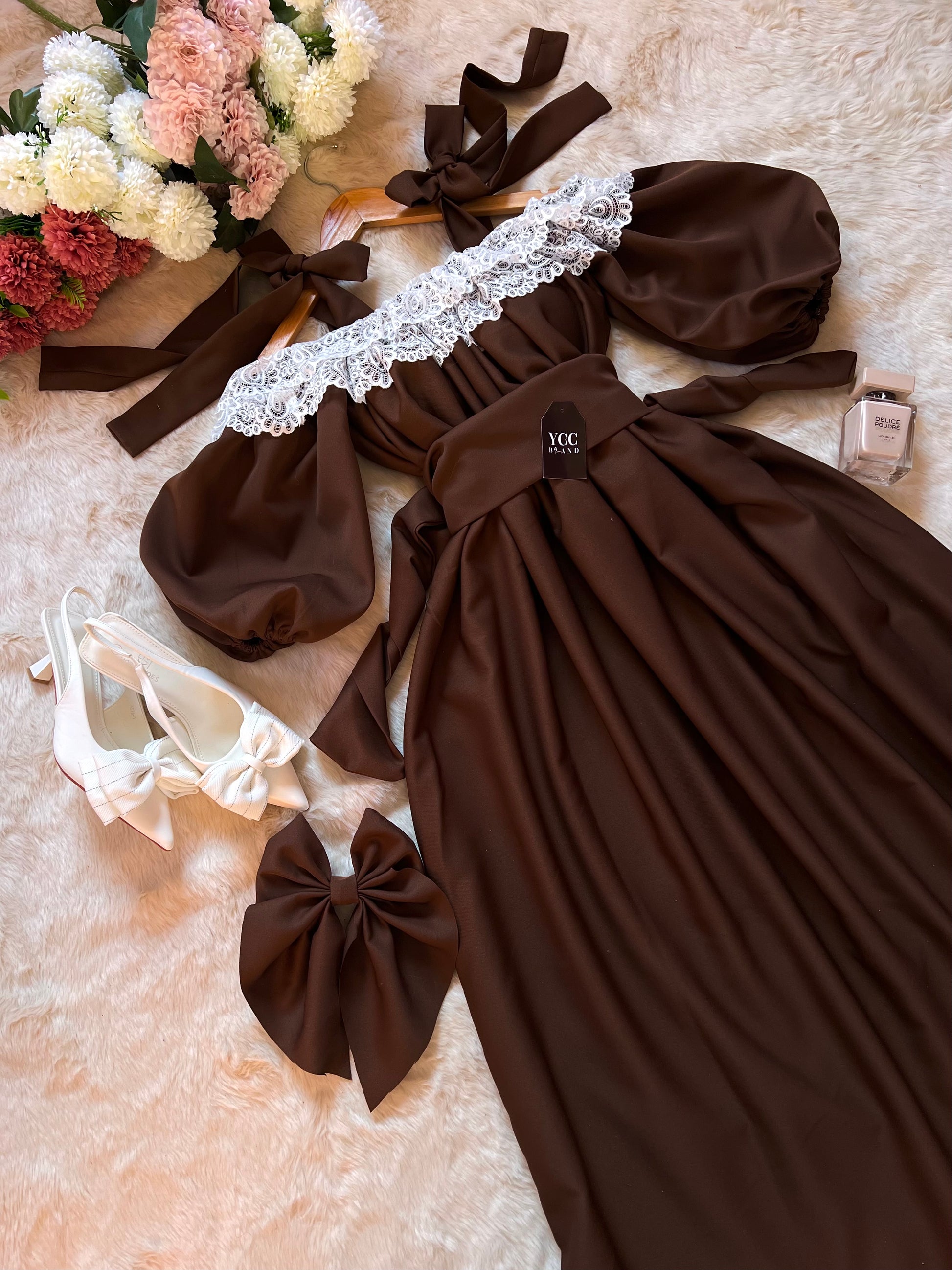 الجزء العلوي مزين بـ دانتيل راقٍ يضفي لمسة رومانسية وأنثوية، مع أكمام منتفخة خفيفة تزيد من جمال التصميم وتميزه.
