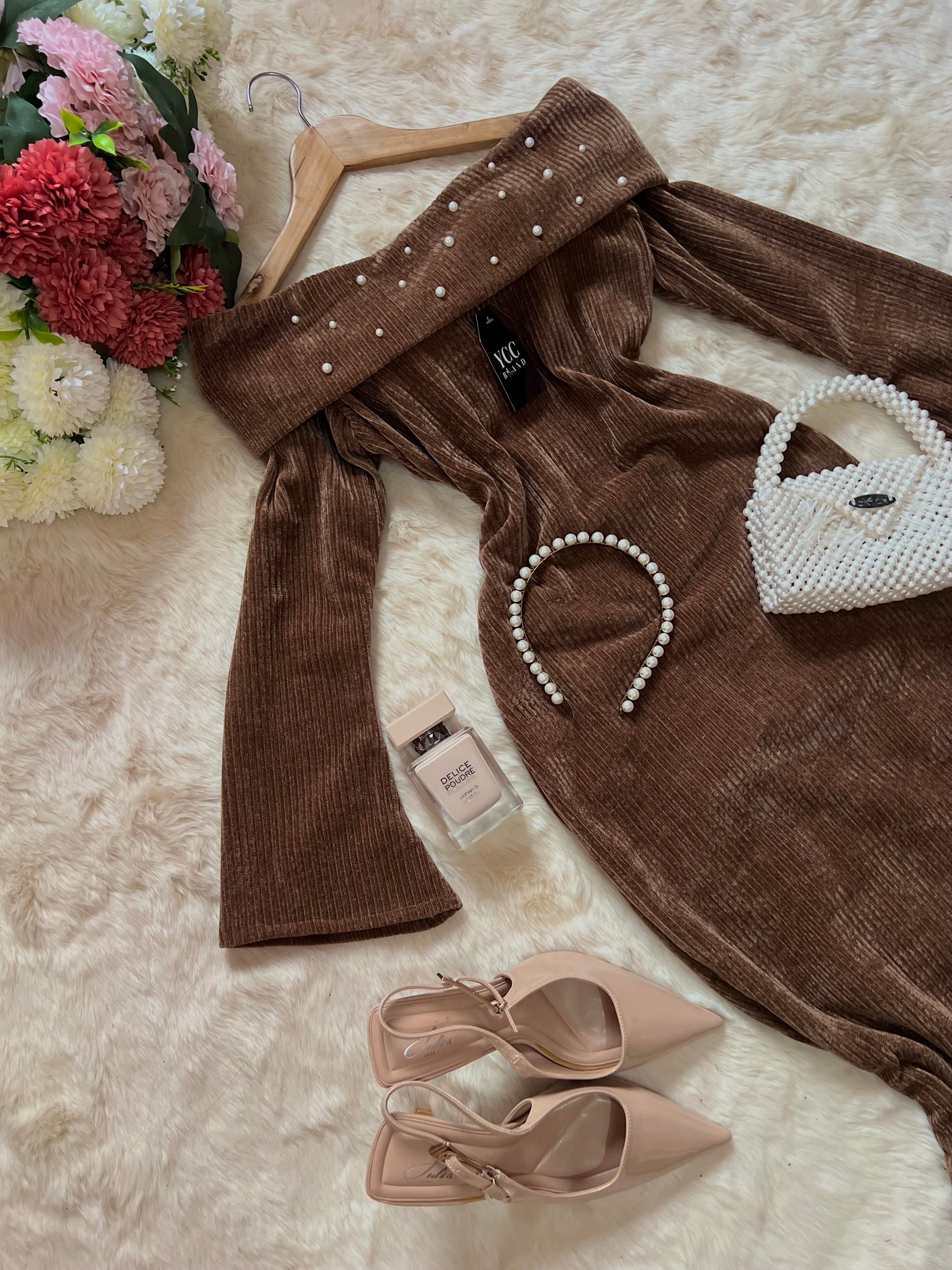 فستان راقٍ بتصميم أوف شولدر من قماش لاكوت، مزين بلمسات لؤلؤية تضيف أناقة فاخرة، وقصّته الانسيابية تبرز أنوثة ناعمة ومظهرًا ساحرًا للمناسبات. ✨