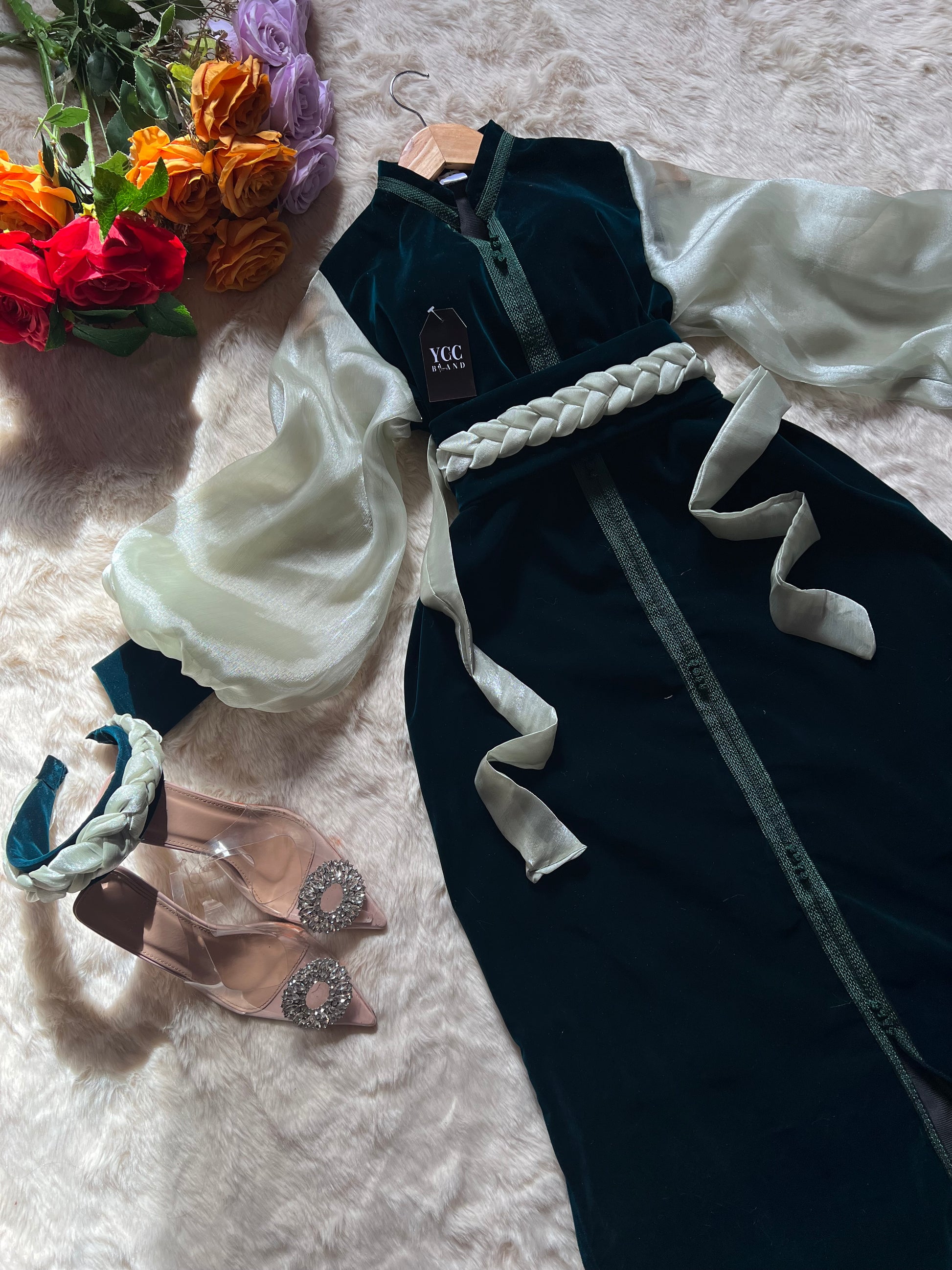 قفطان فخم بتصميم يجمع بين الأناقة والرقي ✨، مصنوع بعناية من قماش دان جابوناز الفاخر المعروف بملمسه الناعم ولمعانه المميز 🌸. يتميز بأكمام شفافة تضيف لمسة أنثوية راقية وانسيابية جذابة 💫، مع حزام مزين بضفيرة أنيقة تعكس تفاصيل الصنعة الدقيقة وتمنح القفطان طابعاً عصرياً ومتجدداً
